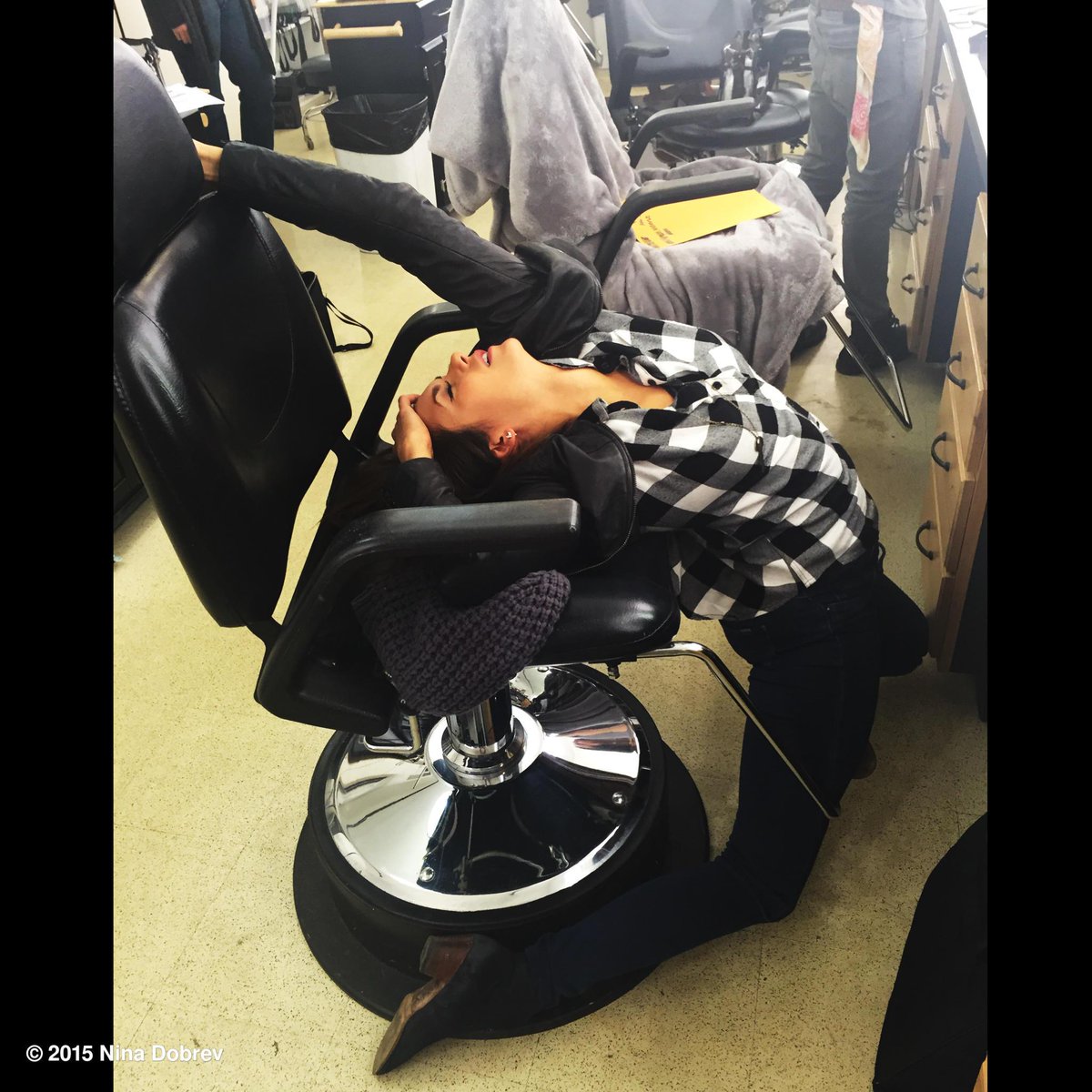 What I like to call "GlamYoga". Morning stretch in the Hair/Makeup chair on set.